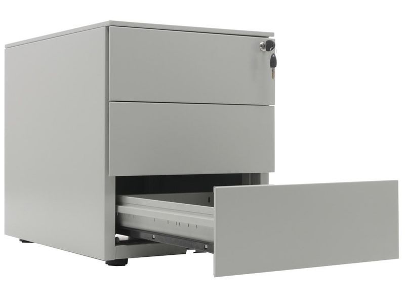 - Опции: пластиковые лотки и металлический ящик для канцелярских принадлежностей и других предметов. Возможность комбинирования цветов: корпус + фасады ящиков и крышка (конструкция тумбы металл+металл). Или отделка фасадов ящиков и крыши тумбы ламинированной плитой ЛДСП