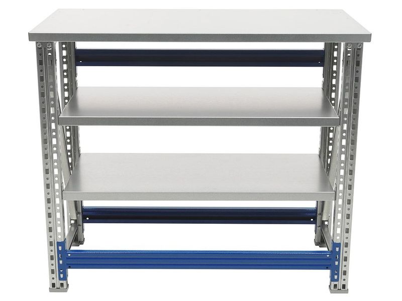 - Основные элементы верстака (опоры, полка, подпятники, накладка на столешницу) изготовлены из оцинкованной стали, что позволяет устанавливать его в местах с повышенной влажностью.